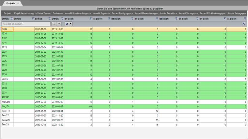 Die Auswertung zeigt alle Projekte welche in den Bereichen der Auftragsbearbeitung, der Fertigungssteuerung und dem Bestellwesen hinterlegt werden können. Analoge Anzeige der Projekte zu Modul 324.