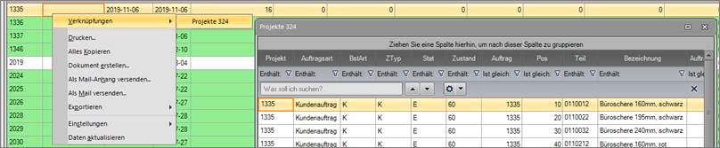 Über Verknüpfungen kann die verlinkte Auswertung (Projekte 324) in einem weiteren Dialog geöffnet werden.