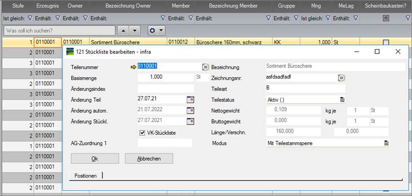 Die Auswertung zeigt die Stücklistenauflösung analog zum Modul 124.