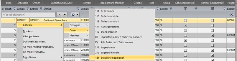Mit Doppelklick auf eine Zeile wird in die entsprechende Stückliste nach PDV121 gewechselt.