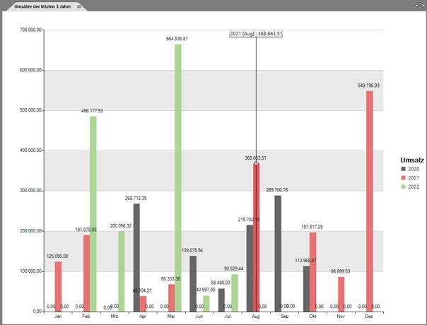 Die Auswertung zeigt in einem Diagramm die kummulierten Umsätze der letzten 3 Kalenderjahre an.