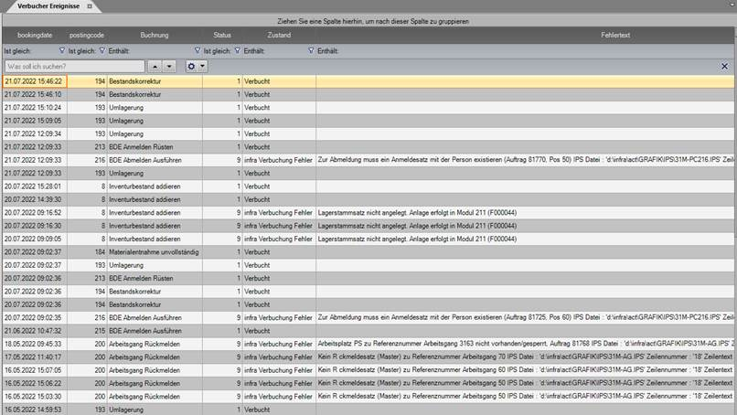 Die Auswertung zeigt alle Ergebnisse aus der Protokolldatei des Verbuchers. Berücksichtigt werden hierbei die unterschiedlichen Postingcodes (Buchungsvorgänge).