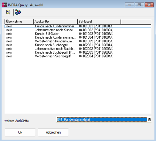 In diesem Dialog werden zunächst die Abfragen zur Auswahl angeboten, die im Standard in der aktuellen Situation vorgesehen sind. Über die Auswahlliste "weitere Auskünfte" können beliebige weitere Abfragen zu allen vorhandenen infra-Tabellen zur Auswahl zugelassen werden.