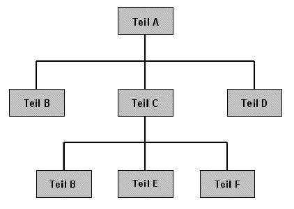 Das Programm "124 Strukturstückliste" ist ein Druckprogramm zum Anzeigen und Drucken der Strukturstückliste. Die Komponenten für das übergeordnete Teil der Struktur werden als erste Auflösungsstufe angezeigt. Diese Komponenten können wieder aus je einem Baukasten bestehen, der sich ebenfalls aus einzelnen Komponenten zusammensetzt. Diese Komponenten können nun wiederum aus einem Baukasten bestehen usw. Jede Komponente, die aus einem Baukasten besteht, wird sofort aufgelöst. Dies geschieht so lange, bis die tiefste Auflösungsstufe erreicht ist. Danach wird die Komponente der nächsthöheren Auflösungsstufe aufgelöst. Die Struktur wird durch das Anzeigen und Einrücken der Auflösungsstufen dargestellt. Stufe 1 sind die Komponenten des Endproduktes, Stufe 2 die Komponenten der 1. Auflösungsstufe usw. Die Auflösung geht zuerst in die Tiefe, dann in die Breite der Struktur.