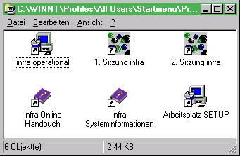 Das SETUP wird abhängig vom aktuellen Bedarf oder auch in einem bestimmten Turnus mehrmals ausgeführt. Die STP-Steuerdatei wird dazu vom SETUP im Verzeichnis INFRA\SETUP\OPTSCR abgelegt und kann aus einer Optionenliste beliebig oft gestartet werden. Der Aufruf erfolgt über ein weiteres Icon ‚infra operational’ im infra-Folder analog zum ‚Arbeitsplatz-SETUP’.