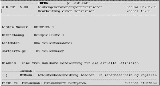 Es wird ein Fenster geöffnet, in dem Listennummer und Bezeichnung der Kopie angegeben werden müssen. Die einzugebende Listennummer darf noch nicht existieren. Mit <F6> kann das Fenster verlassen werden, ohne eine Kopie anzufertigen. <F9> kopiert die aktuelle Definition und legt sie unter der eingegebenen Nummer ab.