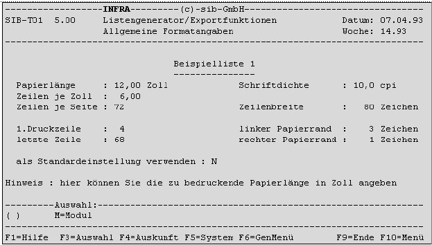 Durch die Eingabe der Menükennung "1" im Listengenerator Definitionsmenü gelangen Sie zu diesem Programmpunkt. Sie können hier allgemeine Angaben zum Format Ihres Ausdrucks machen. Dieser Punkt ist für den Etikettendruck besonders wichtig, da hier die Größe des Druckbereichs den jeweiligen Etikettgrößen angepasst werden kann.