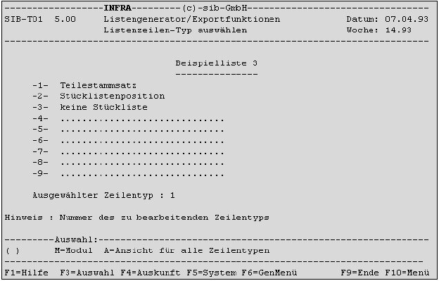 Mit der Menükennung "2" gelangen Sie vom Listengenerator Definitionsmenü zu diesem Programmpunkt. Hier können Sie bis zu 9 verschiedene Listenzeilentypen definieren und anschließend beschreiben. Beim Druck werden die verschiedenen Listenzeilentypen Ihrer Nummerierung nach von 1 bis 9 abgearbeitet und abhängig von der jeweils hinterlegten Bedingung ausgegeben.