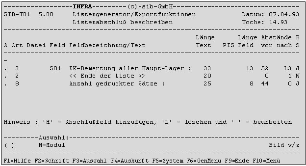 Durch Eingabe der Menükennziffer "3" im Listengenerator Definitionsmenü wird der Programmpunkt zur Beschreibung des Listenabschlusses aufgerufen. Der Listenabschluss wird auf einer Liste ausgegeben, wenn keine druckbaren Datensätze mehr gefunden wurden. Die Definition der Abschlussfelder geschieht analog zur Beschreibung der Listenzeilen.