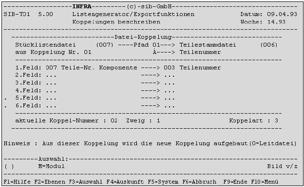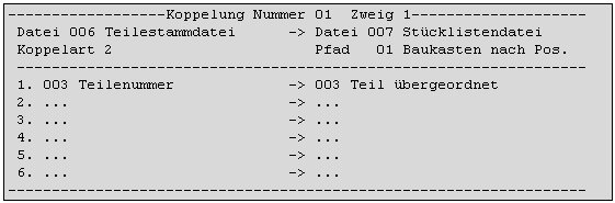 Wie bereits erwähnt, werden die Koppelangaben zu einer bereits bekannten Koppelung vorbelegt. In der Regel existiert nur eine Möglichkeit, eine Verbindung zwischen zwei Dateien über einen bestimmten Koppelpfad herzustellen, bis auf wenige Ausnahmen. So kann z.B. eine Koppelung zwischen der Stücklistendatei (Datei 007) und der Teilestammdatei (006) auf zwei verschiedene Arten über den gleichen Zugriffspfad hergestellt werden. In der Stücklistendatei existieren nämlich zwei Teilenummern, Teil übergeordnet und Teil untergeordnet, über die auf die Teilestammdatei zugegriffen werden kann, jeweils über Zugriffspfad 1 = Teilenummer. Demnach gibt es in diesem Fall zwei Koppelalternativen. Einmal über das übergeordnete und einmal über das untergeordnete Teil. Beide Koppelungen können im Listengenerator definiert und gespeichert werden.