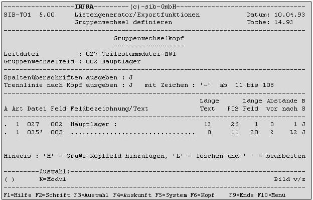 Diese Angabe erlaubt die Ausgabe einer Trennlinie nach dem Gruppenwechselkopf unterhalb der Spaltenüberschriften. Bei der Eingabe von "J" für Ja kann das Trennlinien-Zeichen und die Position der Trennlinie bestimmt werden.