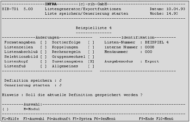 Zum Abschluss der Definitionsarbeiten kann in diesem Bildschirm die Speicherung und Generierung einer Liste veranlasst werden. Zur Orientierung wird in der linken Bildschirmhälfte angezeigt, in welchen Definitionsbereichen Änderungen vorgenommen wurden. In der rechten Hälfte werden die wichtigsten Identifikationsmerkmale angezeigt.